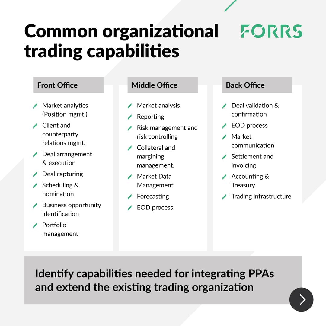 On an organizational level the TOM defines structures across Front-, Middle- and Back-Office, including all organizational capabilities that support the management of PPAs. It provides a comprehensive picture on required business units, including the segregation of responsibilities, trading functions and trading competencies.
