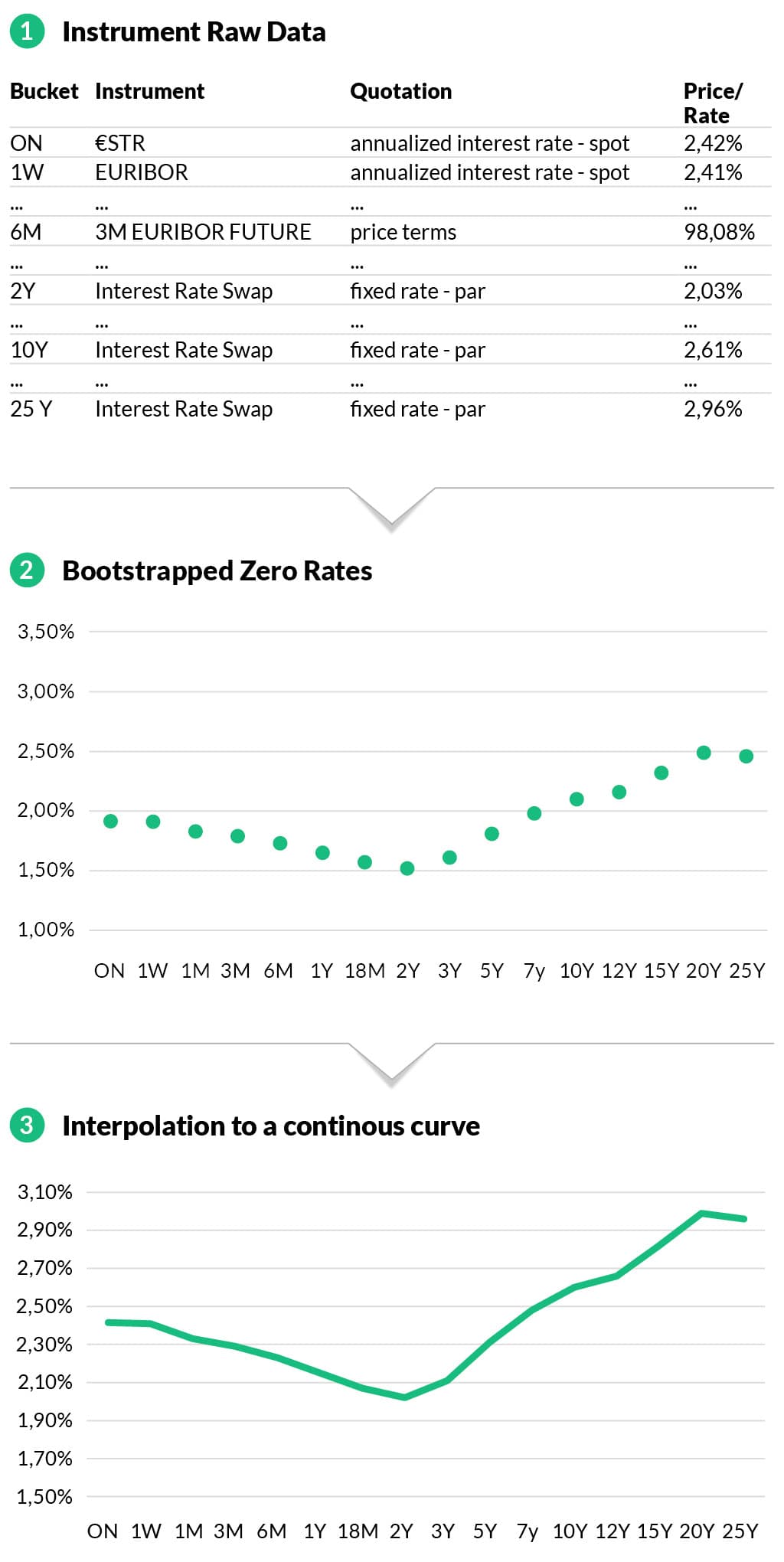 This data series of swap market rate per maturity represents the backbone of a swap curve. We can add non-swap market rates for short maturities where no swap quotes are available. This extended series gives us the so-called pillars of the swap curve. If we now transform different market quotations into a consistent quotation (for example, swap par rates, zero rates, or discount factors) via bootstrapping and agree on an inter(extra)polation method between pillars, we obtain swap market data for each business day in the future.