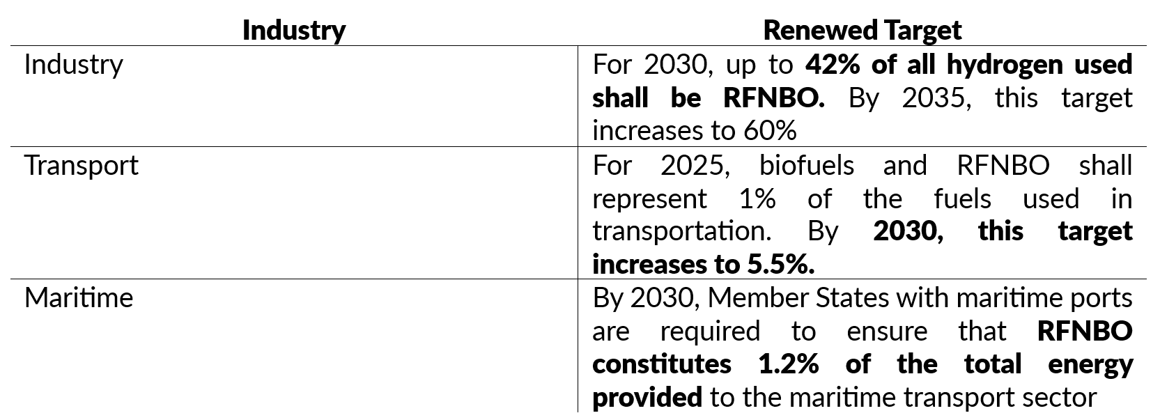 The revised RFNBO targets also bring sector-specific targets (Table 1), clearly outlining the demand-side potential for the use of these types of fuels by 2030 and 2035. Member State countries will have 18 months to add these targets into their national hydrogen plans.