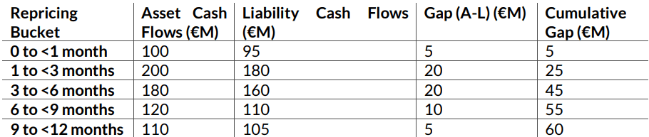 - Cash flow estimation: Identify interest rate-sensitive cash flows from assets, liabilities, and off-balance sheet items and create the gap report by categorizing them into buckets based on their time of repricing.