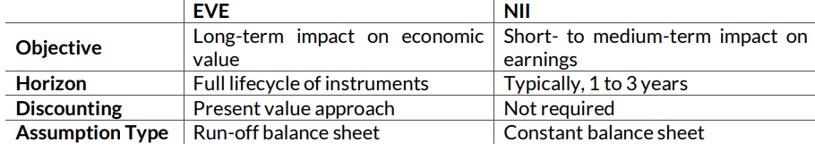 In contrast to EVE, NII evaluates the short- to medium-term effects of rate changes on a bank’s earnings. It assumes a rolling 12-month horizon, assuming a constant balance sheet where maturing assets and liabilities are replaced by similar new business. It measures the difference between projected interest income and expected interest expense from all rate-sensitive assets and liabilities under both baseline and shock scenarios. This approach also uses the gap report plotting out the expected incomes and expenses, collecting them in buckets corresponding to their time of repricing and netting them.