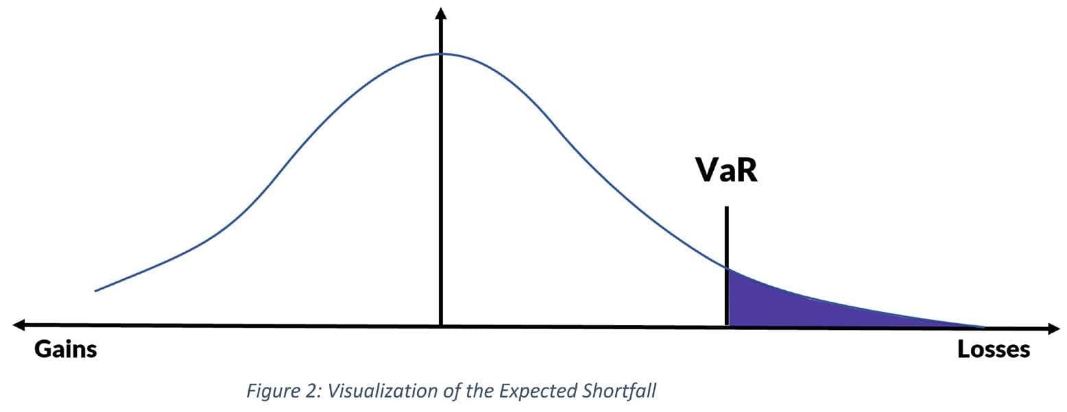 By contrast, Expected Shortfall measures the portfolio’s loss when it exceeds the limit set by VaR (see Figure 2). ES is the expected value of the loss, given the loss is greater than the VaR — or in other words it exceeds the (1–α)-percentile. Below it is visualized as the dark blue area under the distribution function.