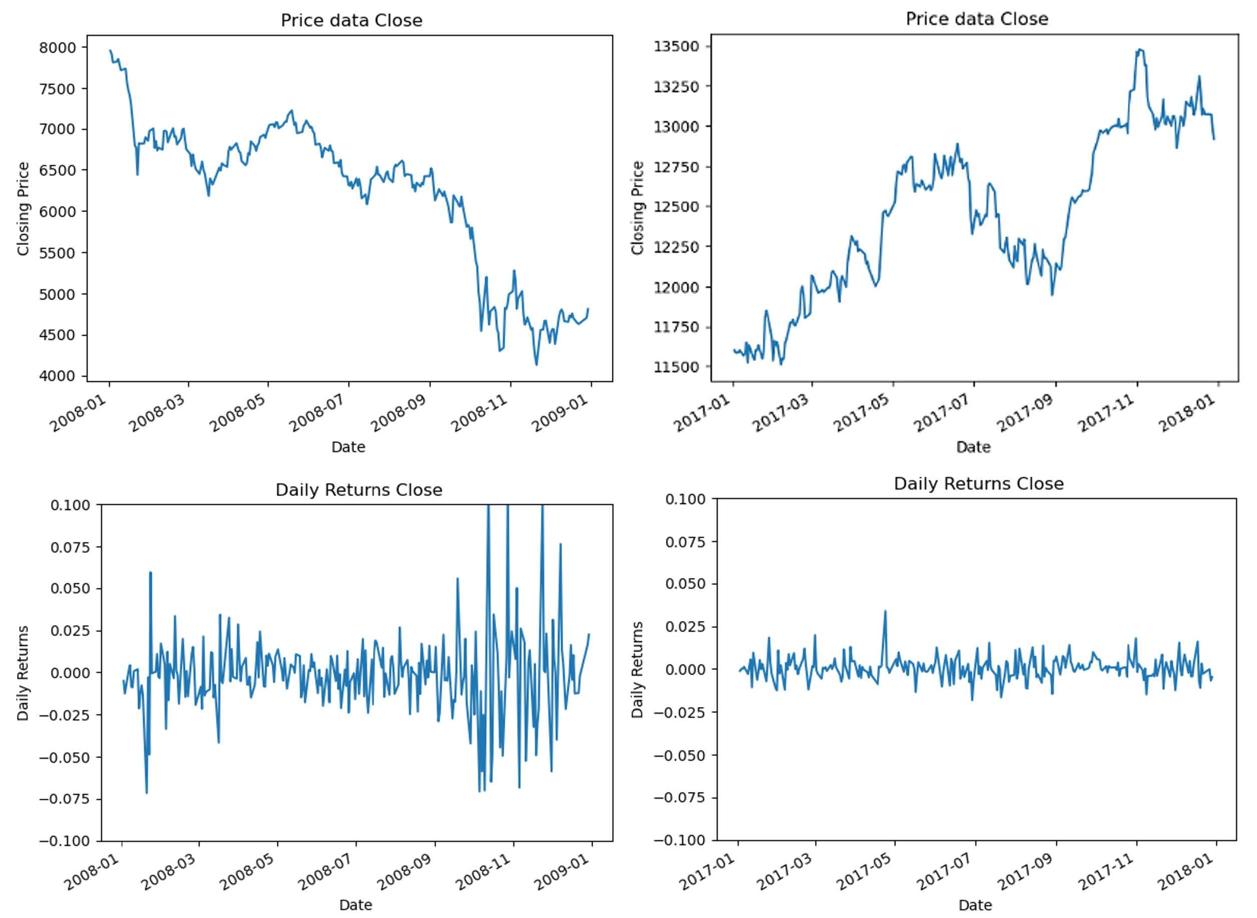 On the contrary, the graphs on the right side depict a period of little market stress. The index is rising steadily and with much less volatility. The daily returns oscillate in a relatively narrow band around the zero percent line.