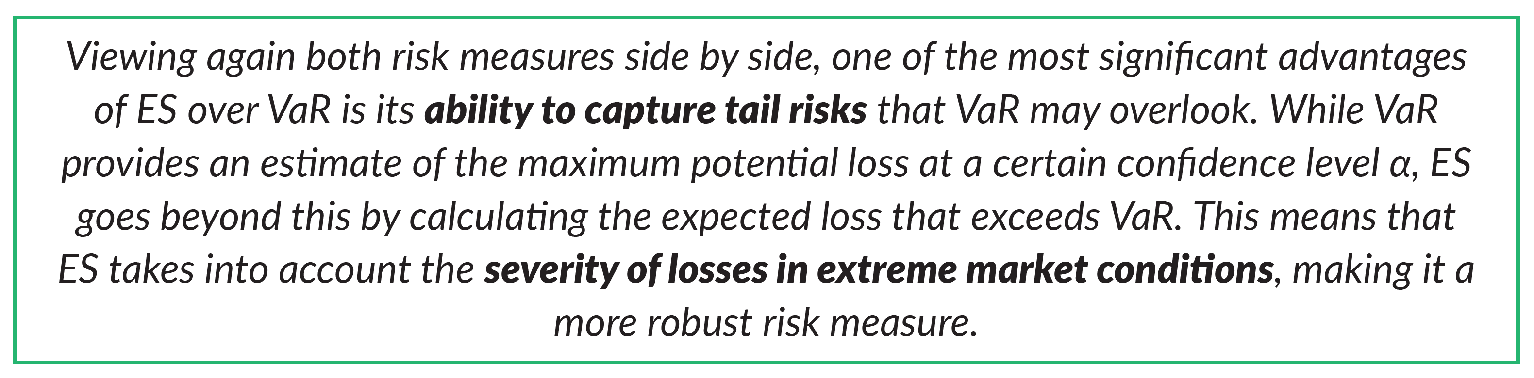 This historical example underscores the importance of adopting Expected Shortfall as a risk measure, particularly in volatile market conditions, as it provides more insights on potential losses than VaR. Nevertheless, keeping an eye on the model risks as well as the input data is critical when employing both measures to ensure good risk estimations.