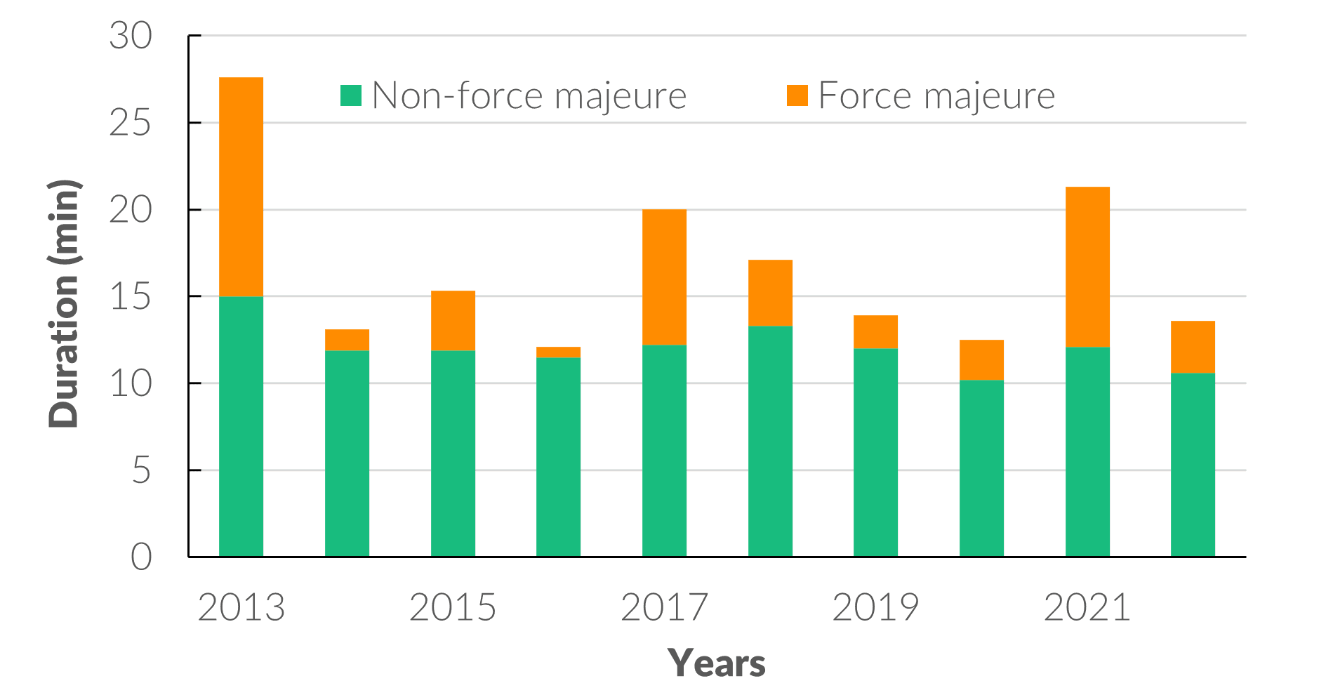 Weather phenomena like lightning, heavy rain, snowfall, high winds and heat waves can impact the distribution, transmission and generation infrastructures of the electricity network. In Germany, extreme weather events such as cyclonic storms in 2013 and 2017 as well as floods in 2021 (Figure 1) had a large impact on the duration of power supply interruptions. In 2021, factors such as network operations, third parties or atmospheric effects not including extreme weather resulted in non-force majeure power supply interruptions lasting an average of 12 minutes per client. While extreme weather contributed to an additional 9 minutes of force-majeure power supply interruptions.