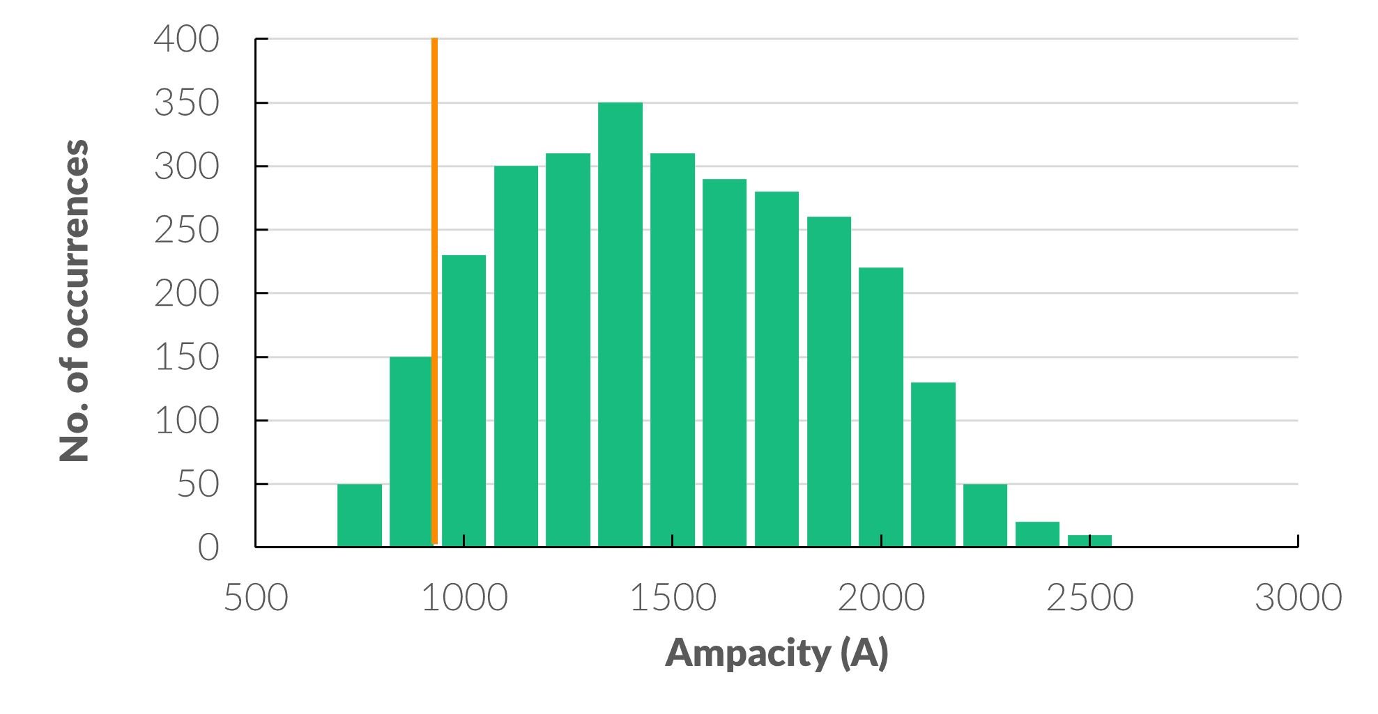 Traditionally, transmission lines are operated using static ampacity values (static rating) to determine the currently available transmission capacity and secure a stable net frequency. These static values are defined by using reasonable estimates of environmental conditions. However, static ratings do not take advantage of changes in the current capacity of transmission lines due to changes in weather conditions. Using real-time measurements of weather parameters such as wind speed, wind direction, solar radiation, and ambient temperature the capacity of the line can be adjusted using dynamic line rating (DLR). The histogram (Figure 3) illustrates the comparison between static and dynamic ratings. Over a given timeframe, DLR enables a more frequent transmission of higher power levels.