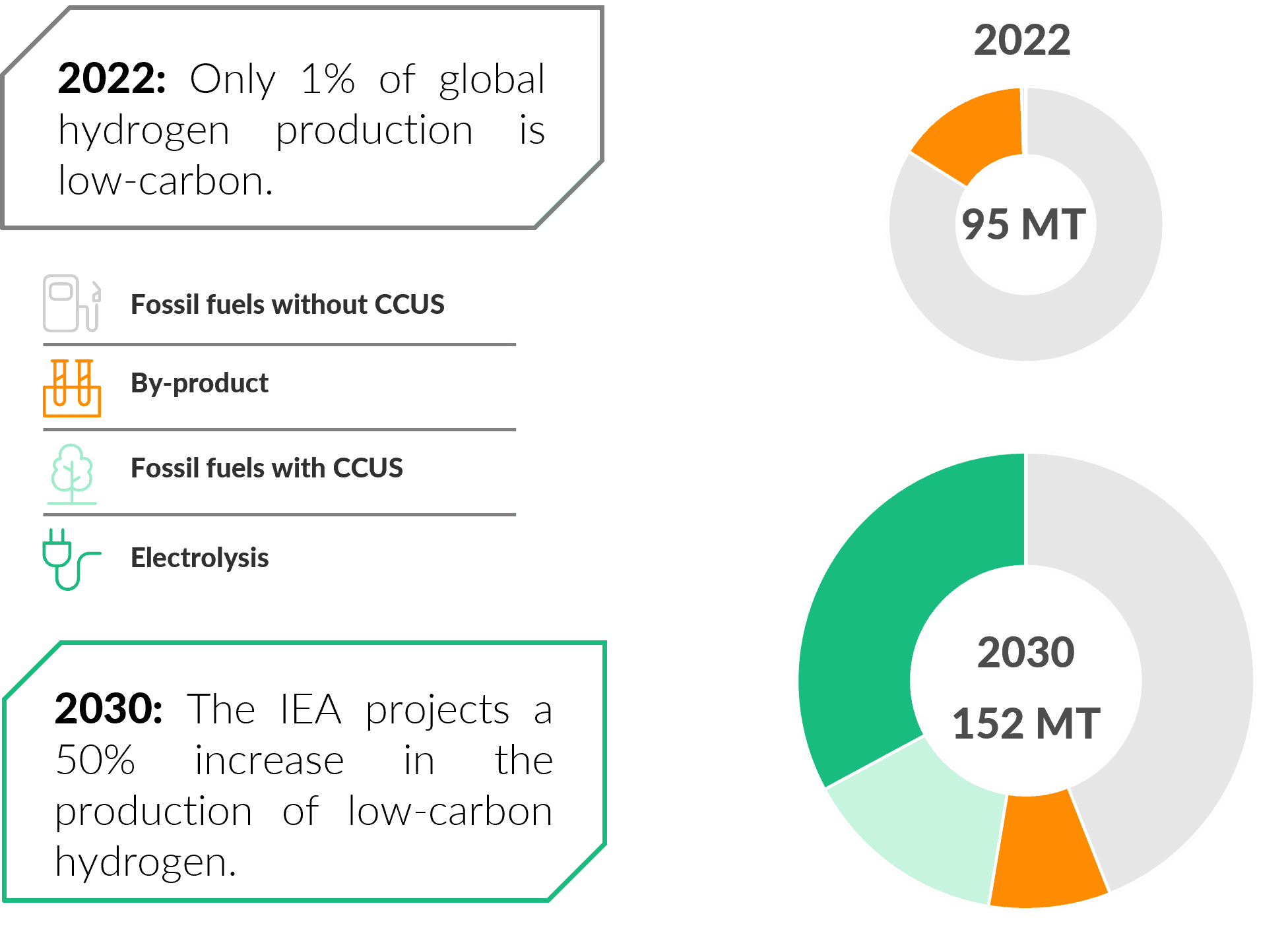 Figure 1: Current (2022) and projected (2030) states of hydrogen production by volume and technology (IEA, 2022)