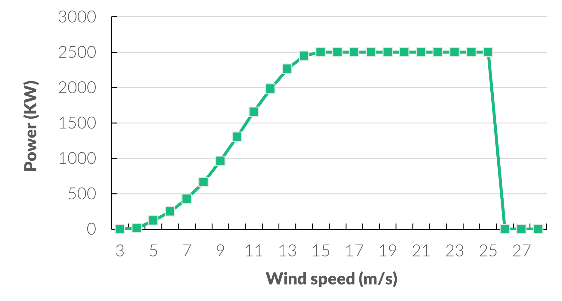 Figure 2. Power curve for a Nordex N80 Alpha 2.5MW wind turbine (Adapted from wind-turbine-models).